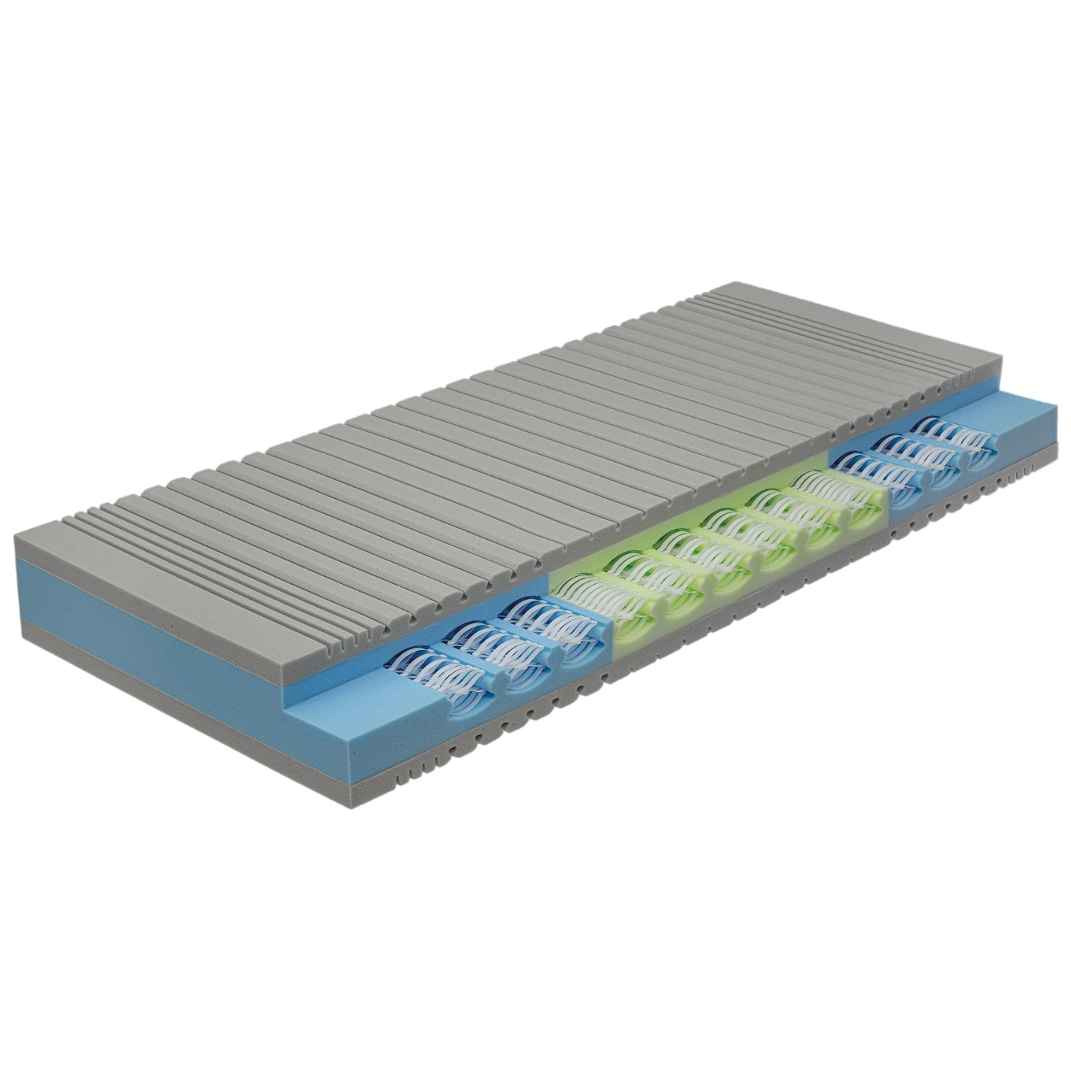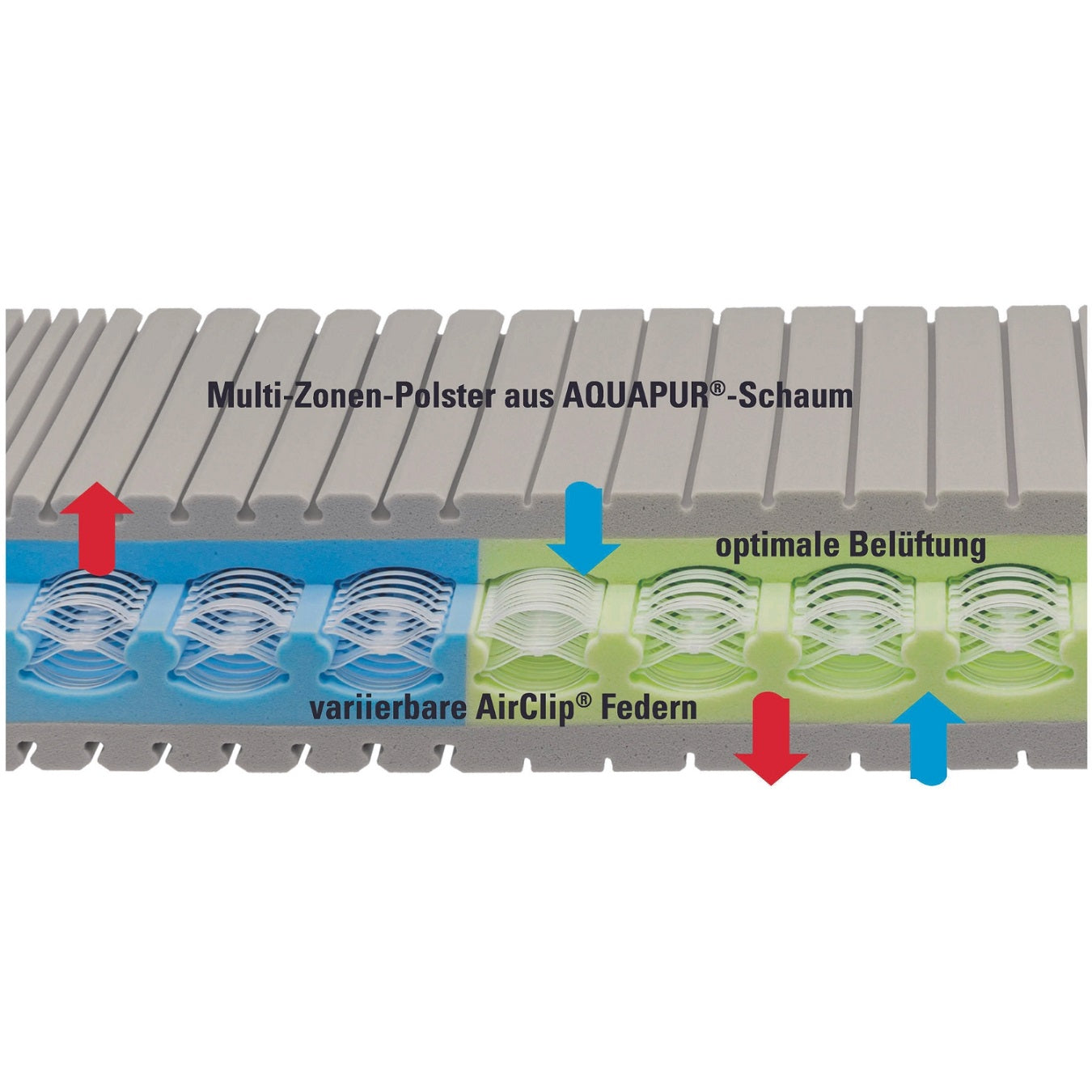 Die individuell einstellbare Matratze: Mit 12 dynamisch wirkenden Einschüben mit AirClip® Hightech-Federn und zoniertem AQUAPUR® Schaum lässt sich die Innova Air C 20 wie keine andere Matratze an Ihre Körperform anpassen. Die Clip-Stränge aus langlebigem und dauerelastischem POM-Kunststoff in unterschiedlichen Festigkeiten sind nicht mit dem Schaum verklebt - dadurch auch recycelfähig – und können somit individuell auf Ihren persönlichen Stützbedarf eingestellt werden. Mit dieser außergewöhnlichen Matratze genießen Sie eine optimale Erholung im Schlaf. Die zusätzliche Sitzkante, generiert durch mehrere AirClips® am Matratzenrand, unterstützt das leichtere Sitzen und Aufstehen. Zusätzlich sorgt der SEAQUAL Jersey-Bezug mit Hygiene-Vlies für extra hohe Reinheit. In der extra festen Version auch für Gewichtsklassen bis ca. 140 kg geeignet.